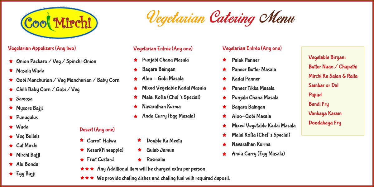 We specialize in catering comfortably to numbers between 15- 250 at this time. If our menus do not feature items that are towards your liking, do let us know, your choice of items will be added to your event and will be prepared to your preferences. Our chefs have exposure to different regional cuisines of India as well as exposure to western cooking concepts. We will be happy to prepare your food, cooked exactly the way you want it and presented accordingly. We invite innovative concepts, if its in your mind let us know, we can help by making it happen!!
